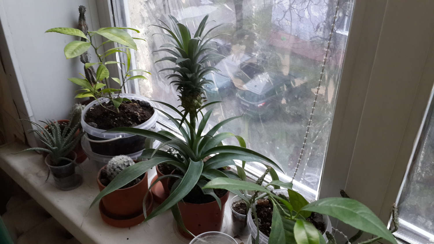 Слегка переместил по подоконнику: из центра рамы чуть ближе к углу, обеспечив Ананасу хохлатому «Mi Amigo» более выгодную освещённость; так как побег растёт вбок, то для Лиметты уровень освещённости не изменился.