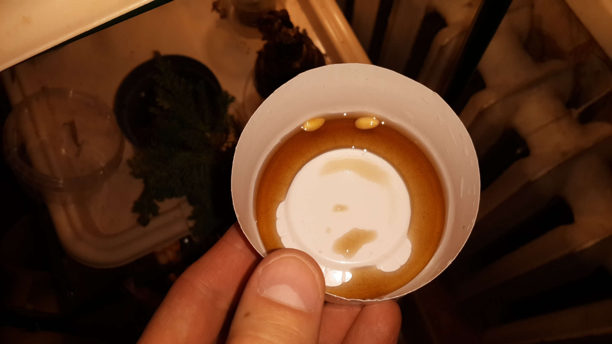 Произвёл посев. В небольшие горшочки (на 50 мл). В структурированный субстрат: нижний слой — обычная смесь; далее — песок (тонкий слой); далее — агроперлит (тонкий слой); сверху засыпал песком. Пролил тёплой водой из под крана, после чего потребовал ещё раз засыпать семя песком, так как оно оголилось от этого.