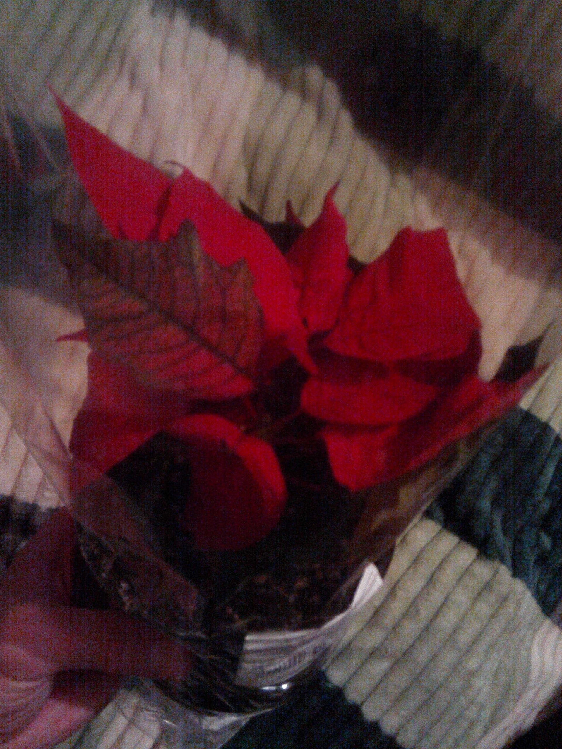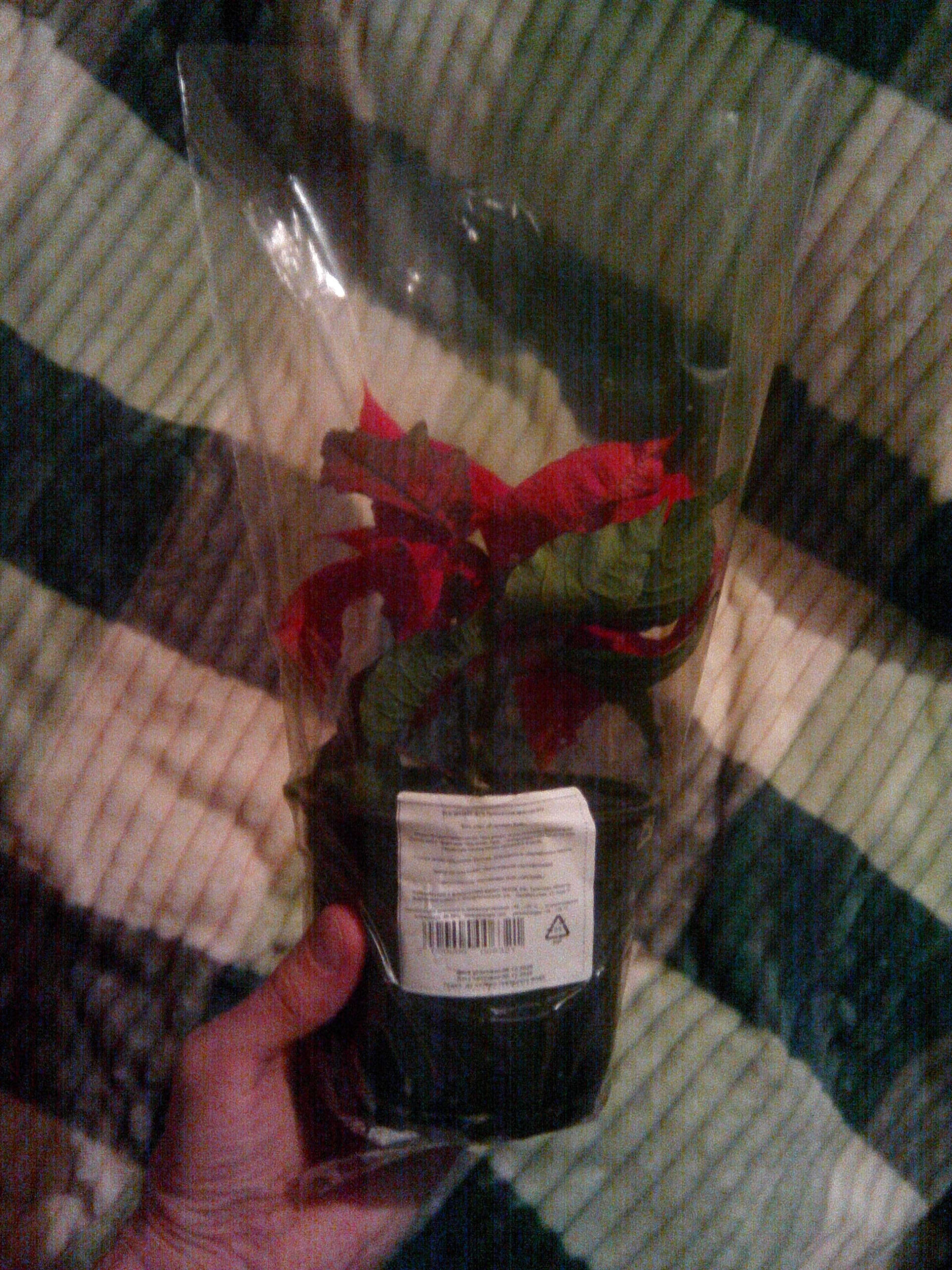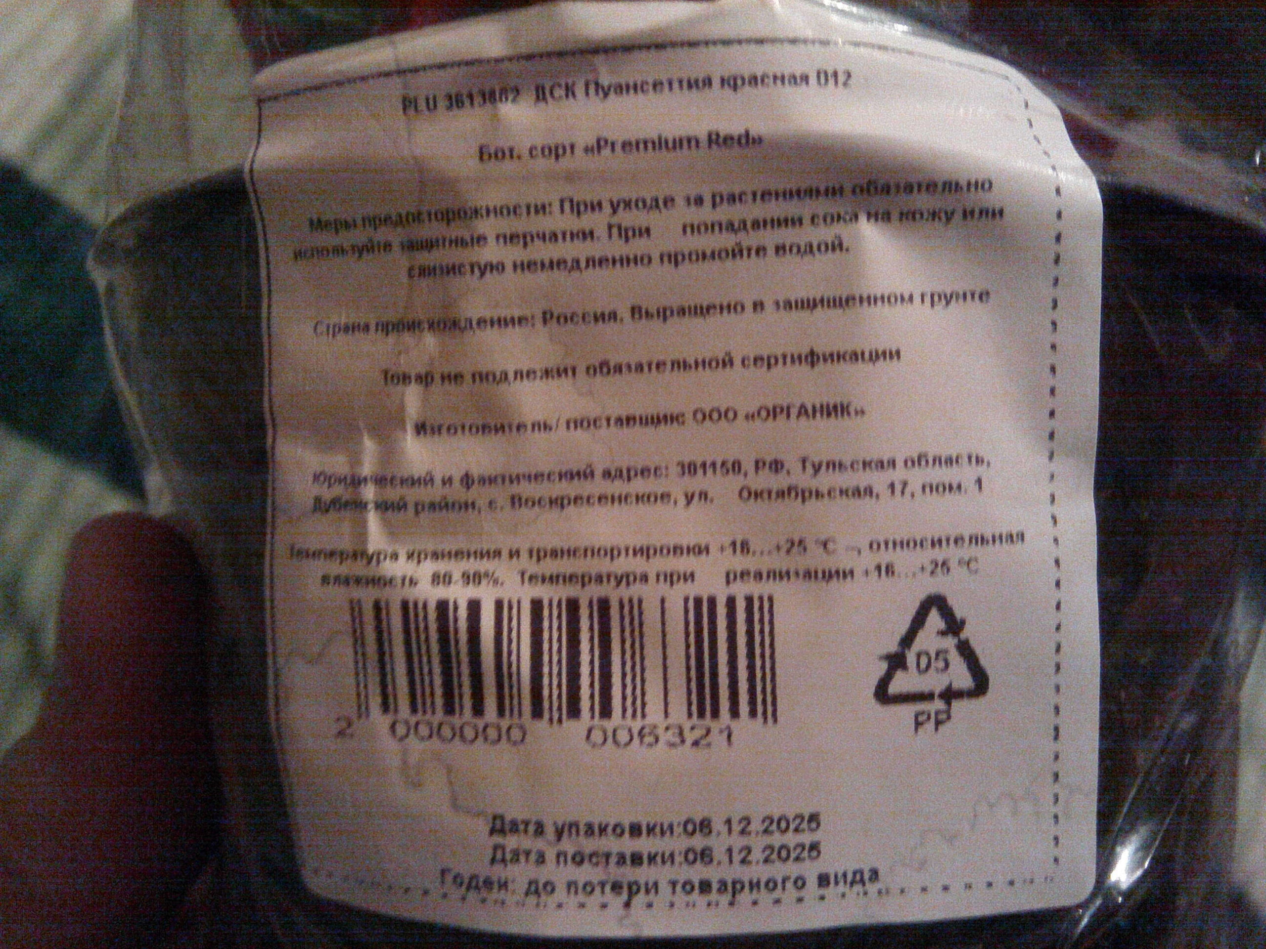 Растение в стадии цветения. Прицветные листья — красные, крупные, прямые. Куст один, разветвлённый, низкий, слегка распростёртый, с выраженной компактностью. Прочие листья — тёмно-зелёные крупные.