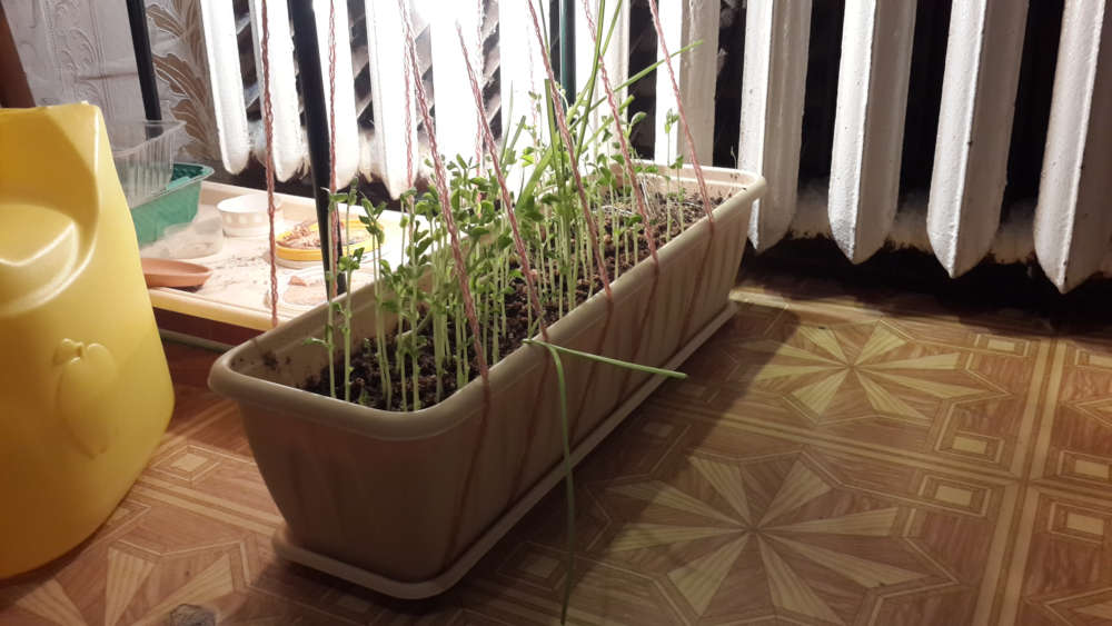 Исхожу из того, что причиной предыдущей неудачей стало переувлажнение из-за выпадения культур, ведь в первое время культура шла успешно. Засеяв ящик целиком почти только Горохом планирую обеспечить оптимальный водный режим субстрата, так как эта культура растёт неплохо в условиях контейнера, то занимая его весь предотвратит застой воды.