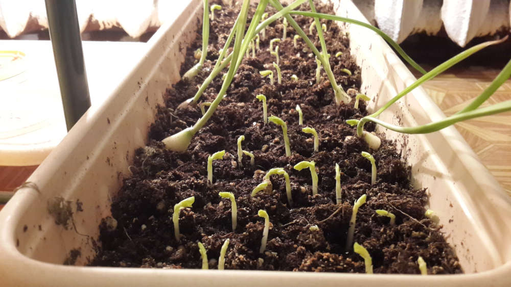 Решил повторить эксперимент, засеяв Горохом весь ящик. Дополнил ещё несколькими рядками Укропа. В ящике также сидит Чеснок (5 луковиц).