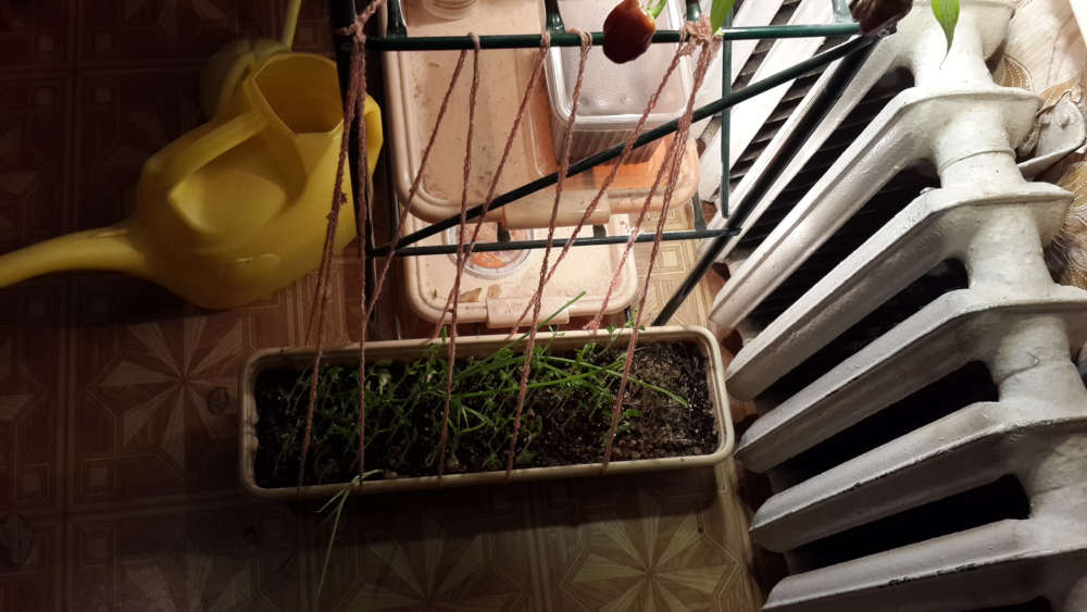 Оборудовал подвязки с целью создания условий для цепляния побегов Гороха. Есть гипотеза, что это необходимо для нормального дальнейшего развития его. В предыдущий опыт опоры не было, возможно это стало одной из причин пропадания культуры.