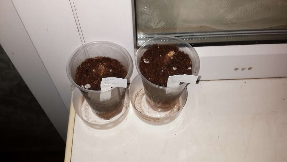 Посадил две луковицы в контейнеры раздельным образом (по одной на контейнер). В качестве контейнеров использовал 100 мл полипропиленовые стаканчики, в которых проделал отверстия (в дне и в стенке).