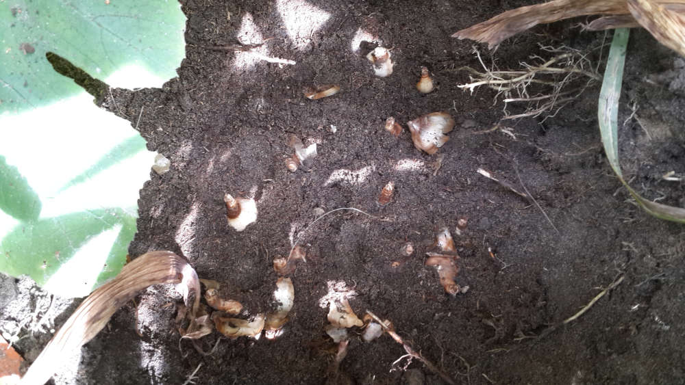 Посадил оставшиеся луковицы в открытый грунт. Подготовил место посадки, прокопав яму на полтора штыка лопаты (в целях разрыхления), и засыпав верхового торфа нейтрализованного на пополам с исходной землёй и добавлением пары горстей биогумуса. Луковицы заделывал на глубину примерно пол-ладони. Не поливал.
