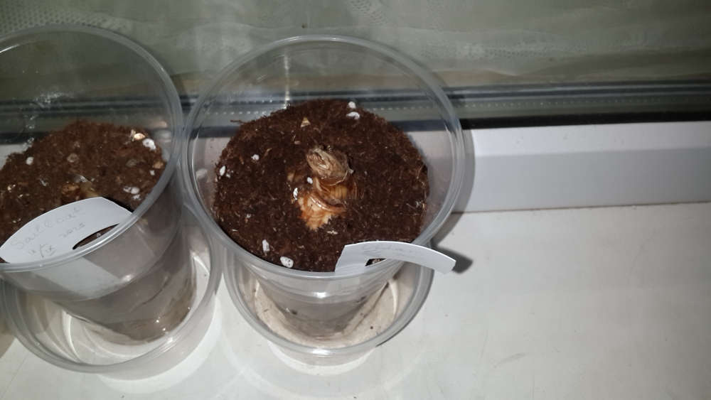 Посадил одну луковицу в контейнер (так как закуплено всего 5, то только одна — для комнатной культуры, в отличии от других сортов, луковиц которых больше). В качестве контейнеров использовал 500 мл полипропиленовый стакан, в котором проделал отверстия (в дне и в стенке).