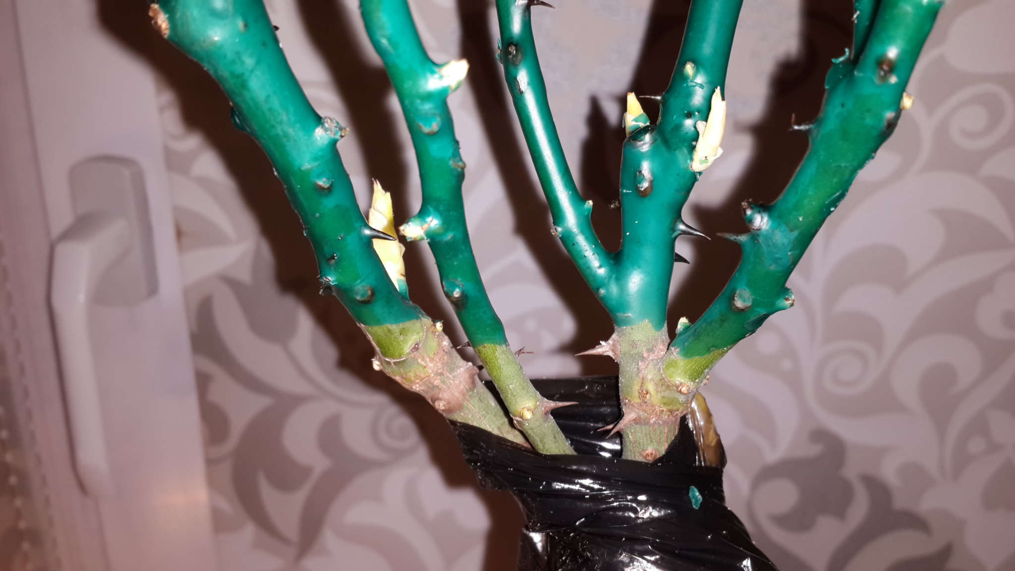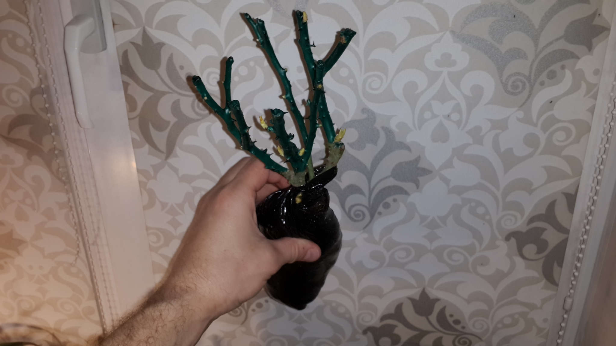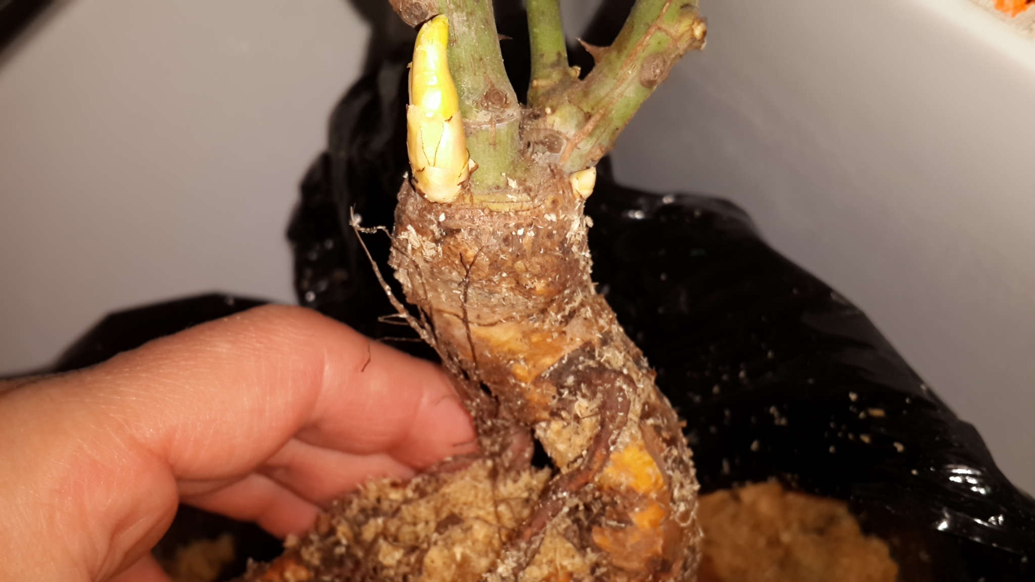 Обильно пролил ком, чтобы насытить растение водой и обеспечить импульс роста. Однако после промыва спустя небольшое время ком на вид как-будто подсох, возможно растение впитало влагу, возможно влага равномерно распределилась по всему сусбстрату, который был сухой. Досыпал сверху верхового торфа и ещё раз пролил, повторил и потом ещё досыпал верхового торфа до такого уровня, чтобы закрыть место прививки (считается, что это помимо всего прочего предотвратит появление поросли Шиповника).