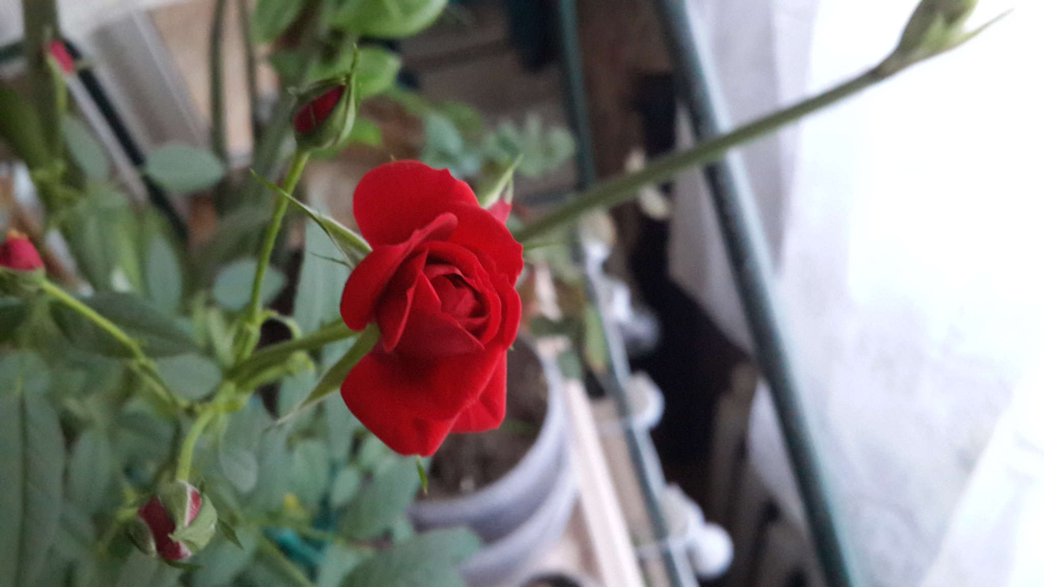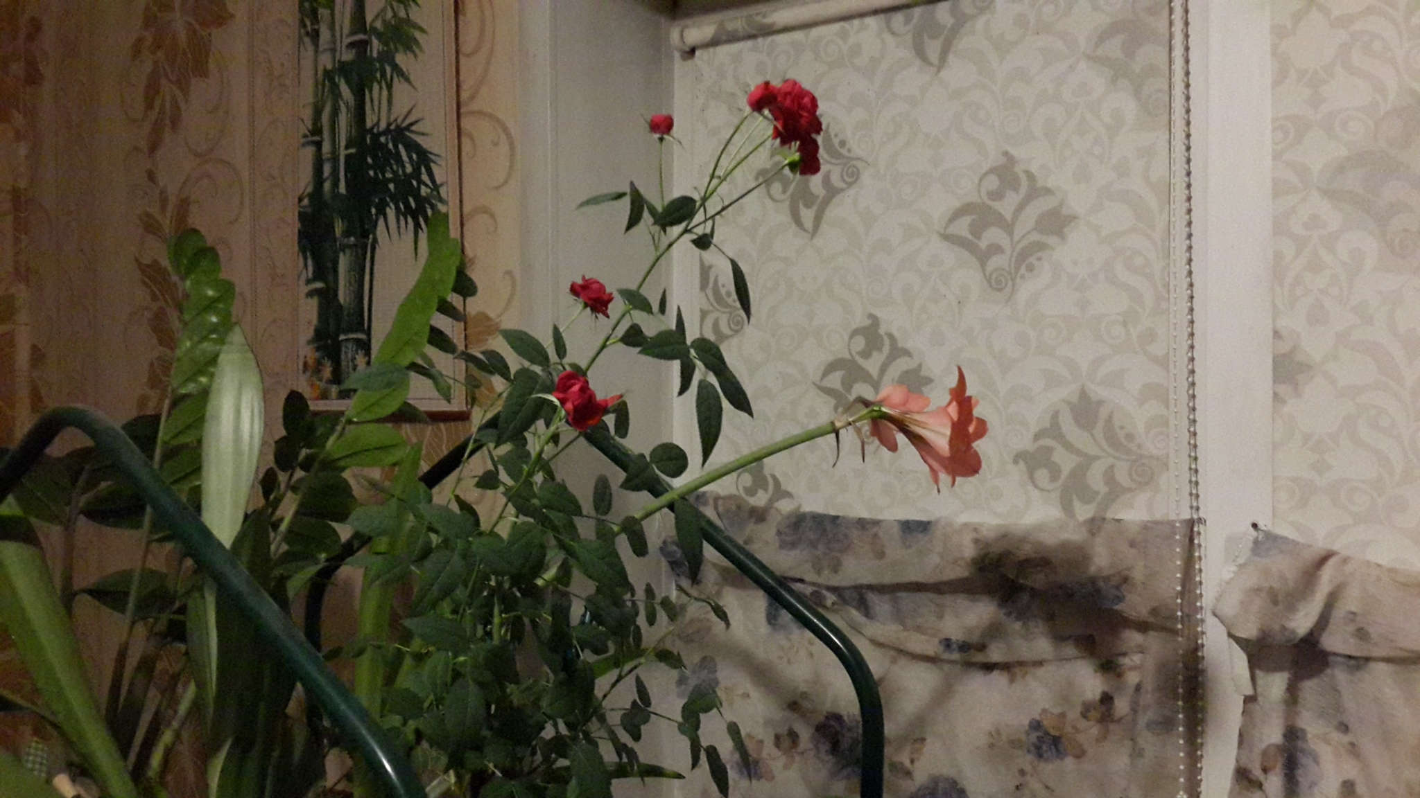 Цветение. На других веточках зреют бутоны (на некоторых проглядывают красные лепестки). Месяц с момента посадки.